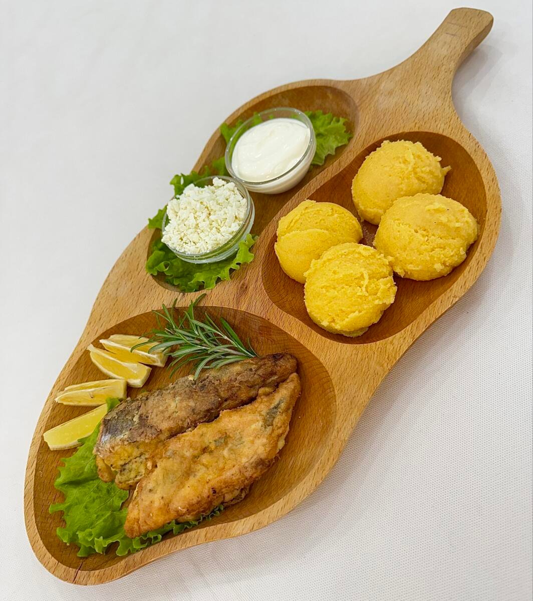 Жаренный хек с мамалыгой